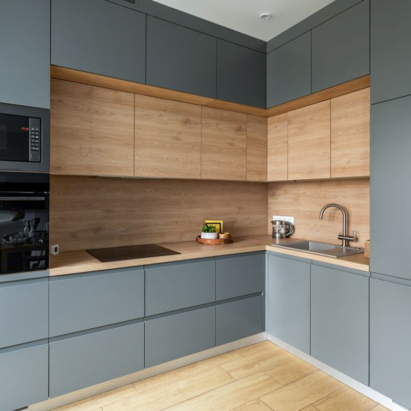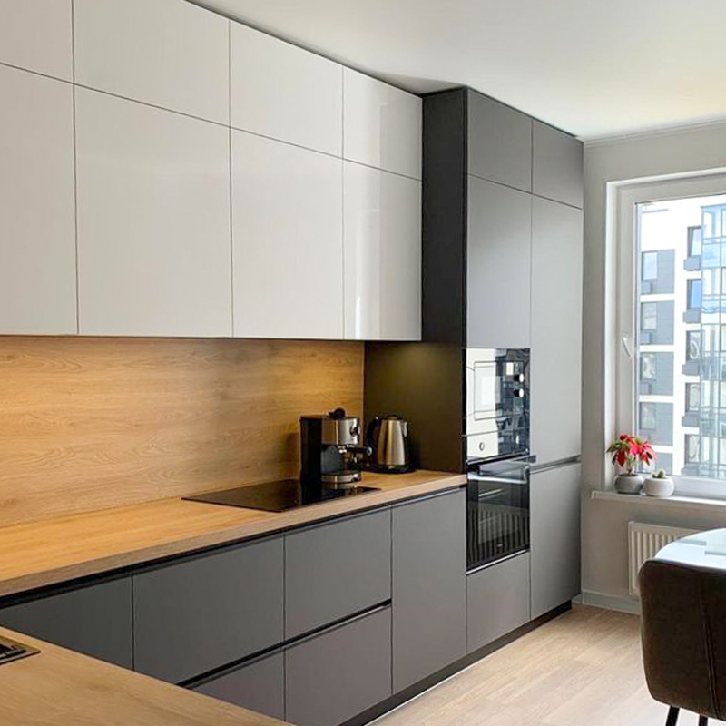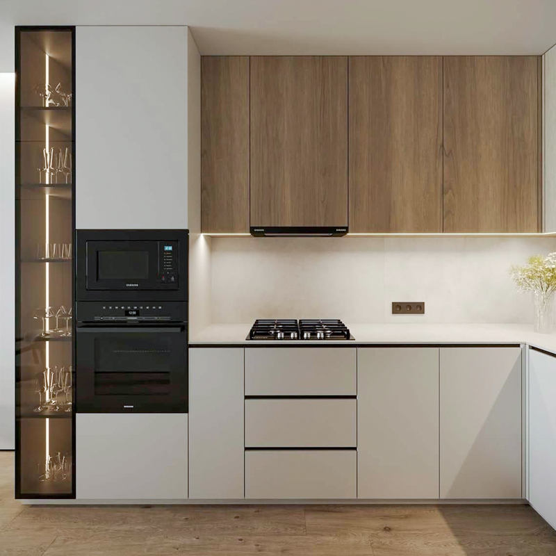 Кухня на заказ в Пиньки, частный дом. Фасады софт матовый акрил и ламинат под дерево EGGER. Фурнитура BLUM, выдвижные ящики Tandembox. Открывание дверей без ручек. Столешница и стеновая панель из пластиката. Витрина с теплой подсветкой и дополнительное освещение столешницы. Срок изготовления 6 недель.